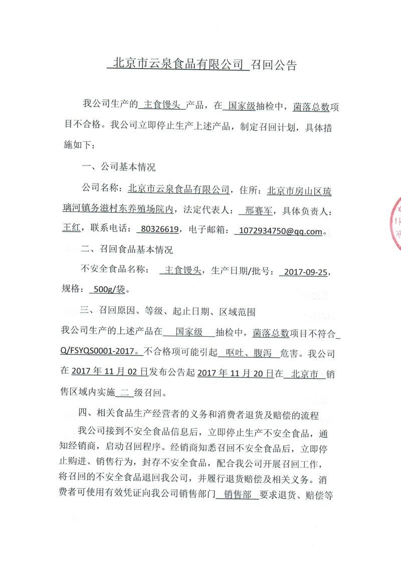 北京市云泉食品有限公司召回公告